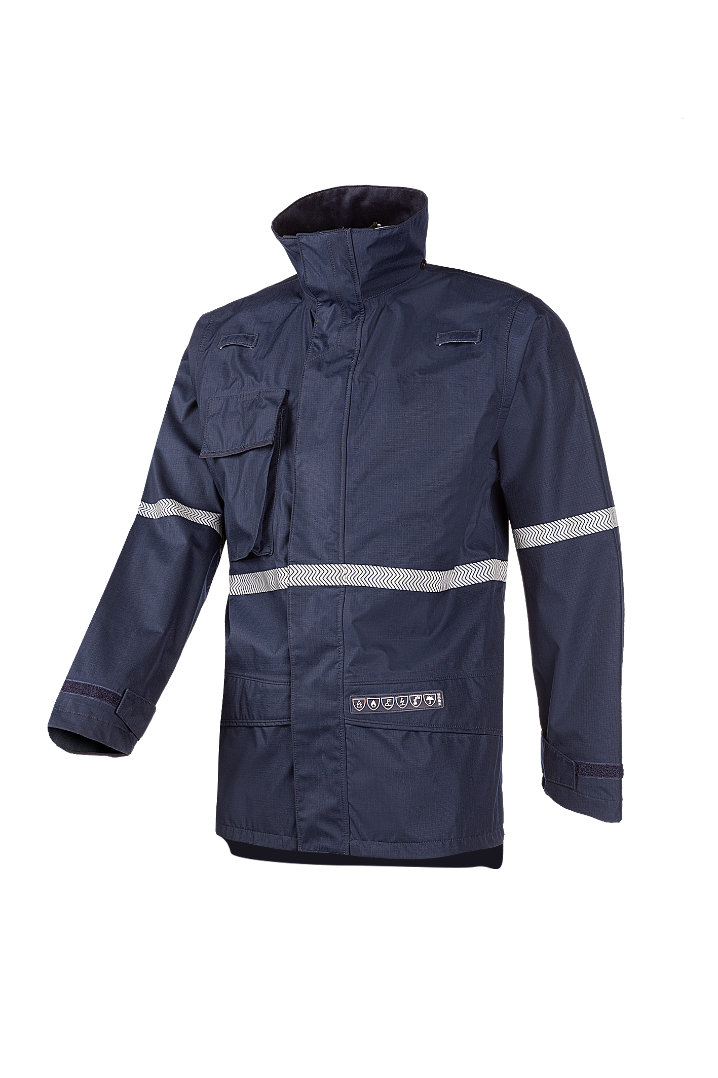 3-lagiges Gewebe: Dobby Ripstop Polyester-Gewebe (& AST) + atmungsaktive FR PU-Beschichtung + inhärentes FR-Gewirk; ± 280 g/m²